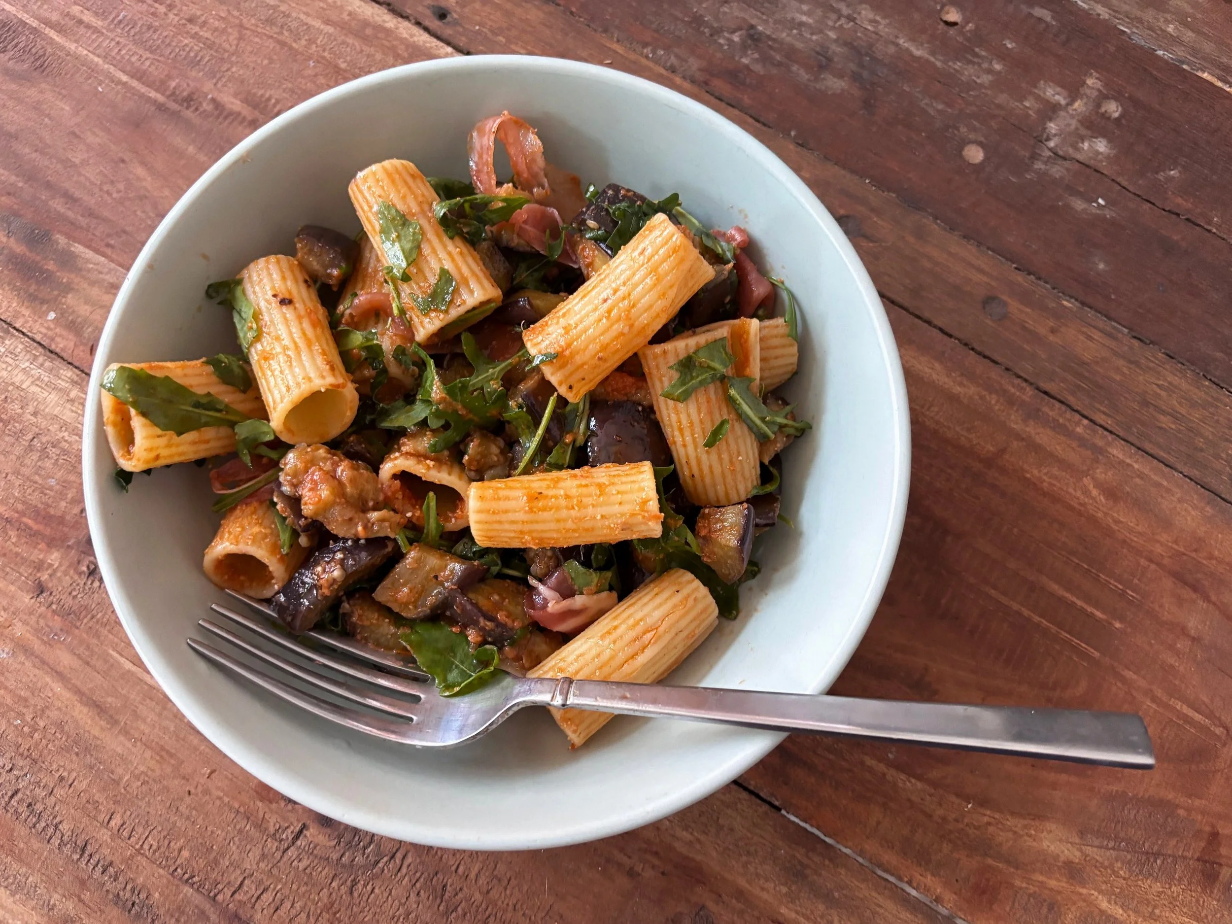 Deze pastasalade is mijn absolute go-to op warme dagen—als ik geen zin heb in gedoe of in uren in de keuken te staan. De credits voor het oorspronkelijke recept gaan trouwens naar go’old Albert Heijn. Met maar zes (!) ingrediënten zit je verrassend goed qua smaak, en je kunt ‘m perfect van tevoren maken. Wat wil je nog meer!? Zo ging het dus bij mij vandaag: pasta gekookt, aubergine gebakken, pesto erdoor geschept… en toen een flinke wandeling met de hond gemaakt terwijl de smaken even konden intrekken. Bij terugkomst hoefde ik alleen nog maar de pasta te versieren met rucola en de prosciutto en een bord op te scheppen. Heerlijk! Mocht je de salade meteen op willen eten, kan dat natuurlijk ook, want lauwwarm is hij ook verrukkelijk. Oh en: ben je geen fan van rucola? Geen probleem. Elk donkerbladig of paarsig blad doet het hier goed. Tenslotte kun je altijd meer ingrediënten toevoegen als je daar zit in hebt. Wat dacht je van doormidden gesneden kerstomaatjes, olijven, of in stukken gescheurde mozzarella.