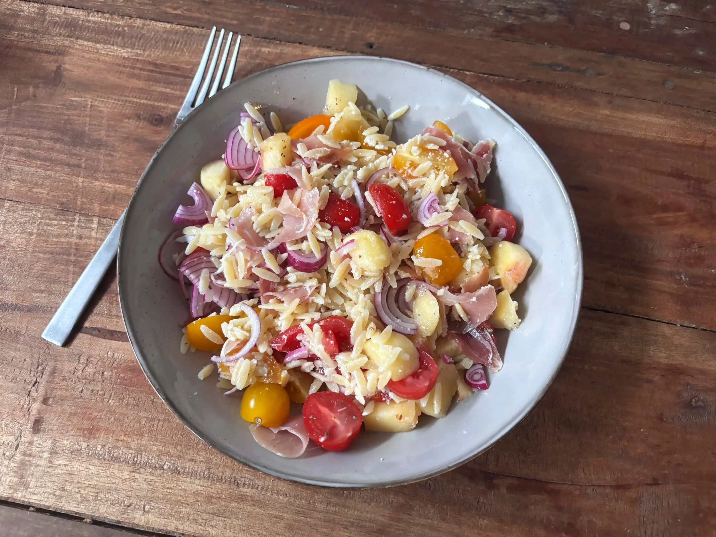 Orzosalade met tomaatjes, nectarine en rauwe ham